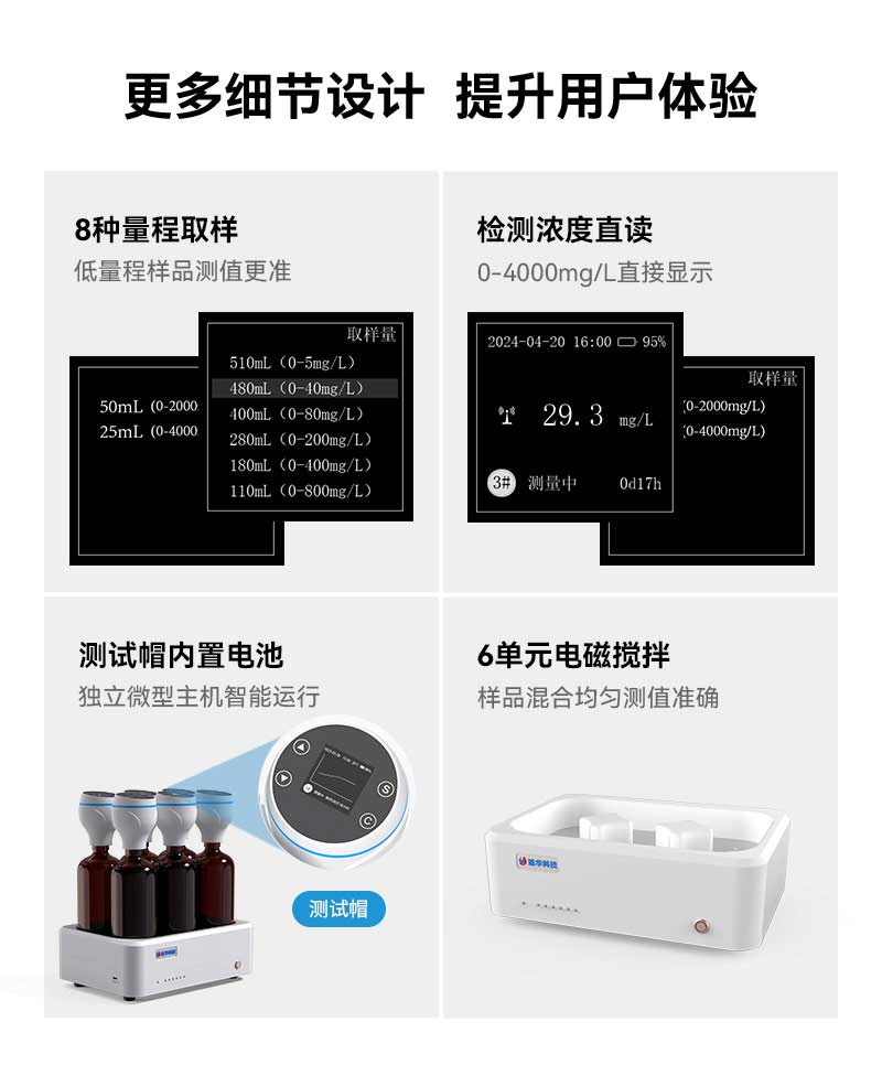 值得一提的是,LH-BOD306的每個測試帽都相當(dāng)于一個微型主機,內(nèi)置CR-P2電池和1.5吋OLED屏幕,可獨立運行并查看檢測數(shù)據(jù)、數(shù)據(jù)曲線圖等信息。這一創(chuàng)新設(shè)計使得即使在主機短暫停電的情況下,測試也不會受到影響,確保了數(shù)據(jù)的連續(xù)性和完整性。